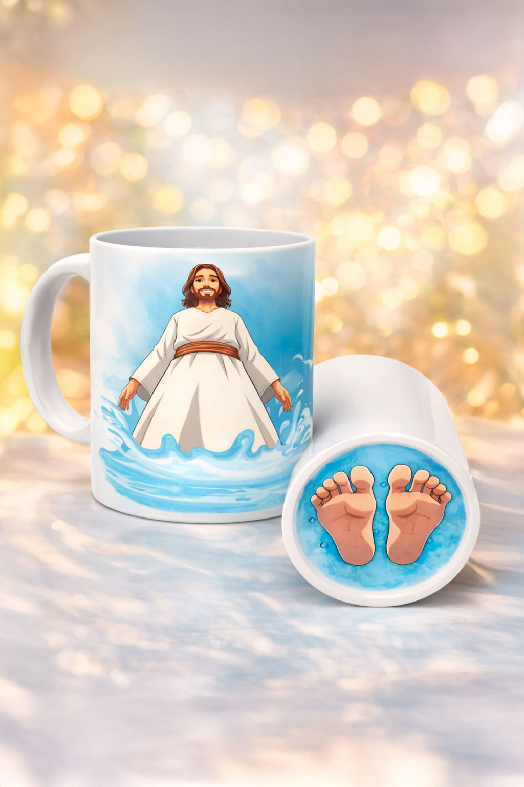 Ao virar a caneca, você vê os pés de Jesus na base. Um detalhe simbólico, profundo e emocionante que transmite uma mensagem silenciosa: